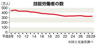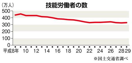 建設現場の担当者は「50歳以上の職人の姿ばかりが目立つようになった」と声をそろえる。日本建設業連合会(日建連)によると55歳以上の割合は約3分の1を占める一方、10~20代の割合は約1割。労働時間が長いことなどが若年層に敬遠されがちなようだ。