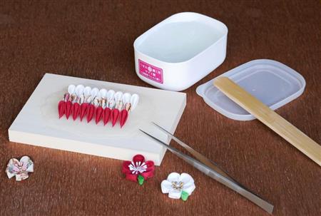 手工芸「つまみ細工」用に開発したでんぷん糊。高粘度にすることで花びらなどのパーツの形を保持し、作品がきれいに仕上がる。390円(税別)。手芸専門店などで販売中。
