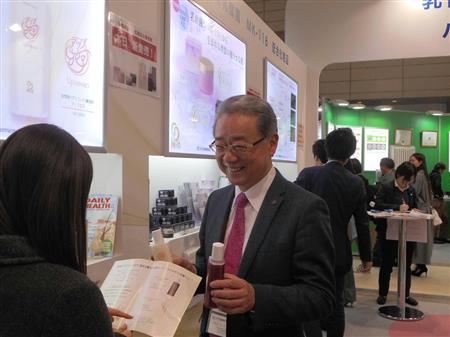 1日まで千葉市・幕張メッセで開かれた日本最大規模の化粧品専門展「COSME TOKYO 2019」に出展した同社の安本昌吉社長は顧客開拓に手応えを感じた。ブースに並んだのは独自開発した乳酸菌「MK-116」を配合した基礎化粧品と養毛剤だ。
