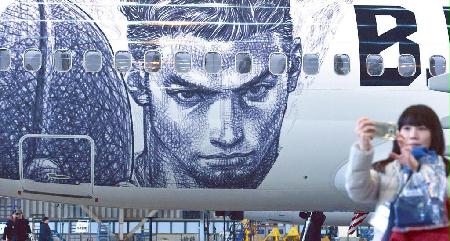 スカイマークはバスケBリーグの「特別塗装機」を報道陣に公開した。機体後方には井上雄彦さんのイラストが描かれている=4日午後、羽田空港(佐藤徳昭撮影)【拡大】