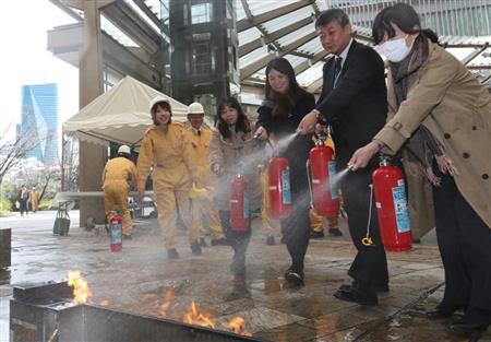 森ビルは11日、六本木ヒルズ(東京都港区)で震災訓練を実施した。オフィスで働く人や、マンションの住民などおよそ800人が参加した。六本木ヒルズは人工地盤としたことで、耐震性能が高く、震災などの際に「逃げ込める街」としてアピールしている。訓練では、応急手当てや救急搬送などの体験コーナーが用意され、自動体外式除細動器(AED)や心臓マッサージによる心肺蘇生(そせい)の体験などが行われた。このほか、火事を見つけたことを周囲に大きな声で知らせ、参加者自身が実際に消火器を使って鎮火させた。