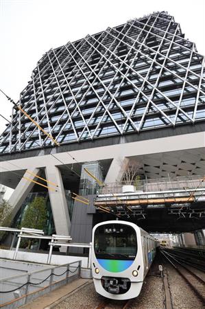 新本社ビルは、西武鉄道の西武池袋線の線路をまたぐ形でつくられた。