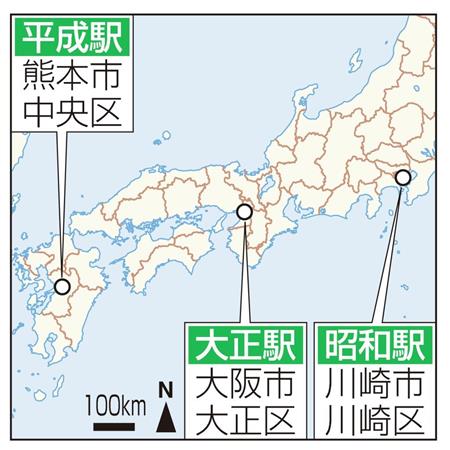 大正、昭和、平成と名前が同じJR各社の駅が話題になっている。大正駅は大阪市、昭和駅は川崎市、平成駅は熊本市にあり、「昭和→平成」と印字された切符を購入し、旅行をした人も。新元号「令和」駅も、いつかどこかで誕生するのか-。