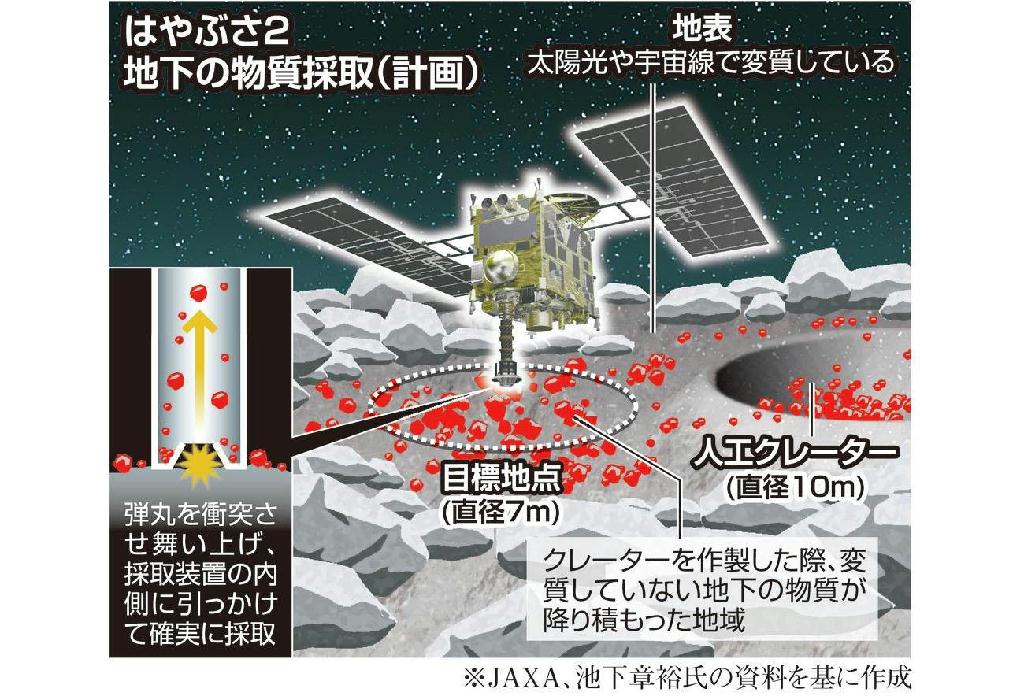 天体の地下にある物質の採取は米アポロ宇宙船の飛行士が月で行ったが、小惑星などの小さな天体ではまだ成功例はない。はやぶさ2が持ち帰れば、世界初となる。