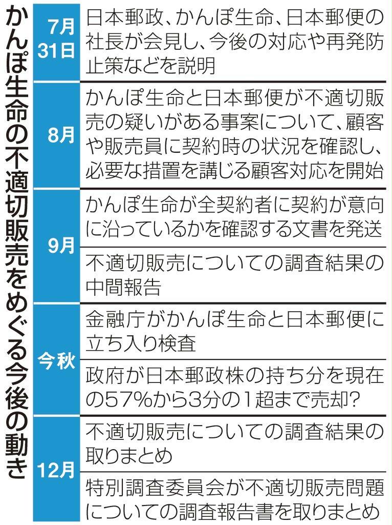 調査の過程で不適切な販売を行っていた職員が発見された場合、保険を販売する資格の停止を含めて厳正に対処する。今年度はかんぽ生命商品の販売目標は設定しないほか、来年度以降についても販売額から残高ベースで職員を評価する体系に切り替えるとした。