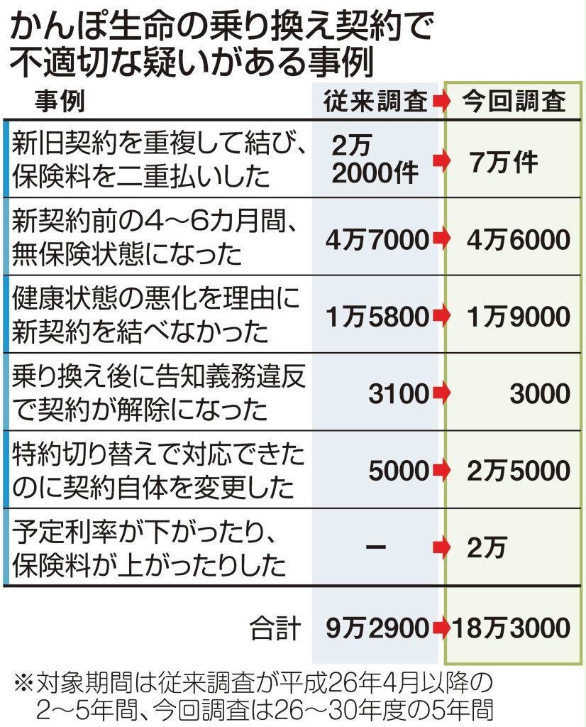 日本郵政傘下のかんぽ生命保険が保険の不適切販売を繰り返していた問題で、日本郵政とかんぽ生命、日本郵便は31日、保険料を二重に徴収するなど顧客に不利益となった恐れのある契約が過去5年間で約18万3千件に上ると正式に発表した。また、過去5年間で消滅した契約を含むかんぽ生命保有の全契約の計約3千万件についても顧客に不利益が出ていないか調査する方針を明らかにした。