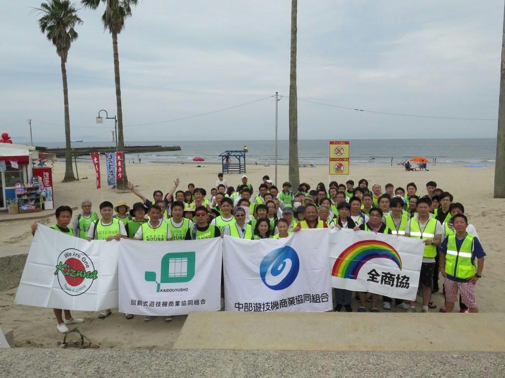 回胴式遊技機商業協同組合(回胴遊商、理事長・大饗裕記氏)の中部・北陸支部(支部長・坂井洋一氏)と、全国遊技機商業協同組合連合会(全商協、会長・林和宏氏)所属の中部遊技機商業協同組合(中部遊商、理事長同じ)は7月13日、愛知県知多郡の内海海岸千鳥ヶ浜海水浴場で合同海岸清掃活動を実施した。回を重ねるごとに参加者は増え、今回は総勢103人が参加。各自ポリ袋を手に砂浜を回り、捨てられているごみなどを拾って歩いた。