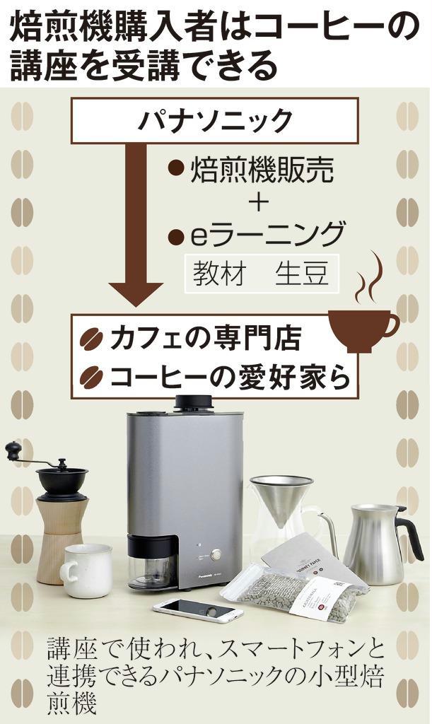 パナソニックが、カフェで働く人らを対象に、コーヒーの焙煎(ばいせん)に関する知識や技術をインターネット上で学べる「eラーニング」講座を始めることが7日、分かった。同社の焙煎機を使い、豆の産地や焙煎の度合いによる味の違いを実践形式で学ぶことができる。コーヒー業界では、豆の品質や焙煎にこだわる「サードウエーブ(第3の波)」と呼ばれるカフェが増えており、同社は講座を通じてこうした新しい需要を取り込みたい考えだ。