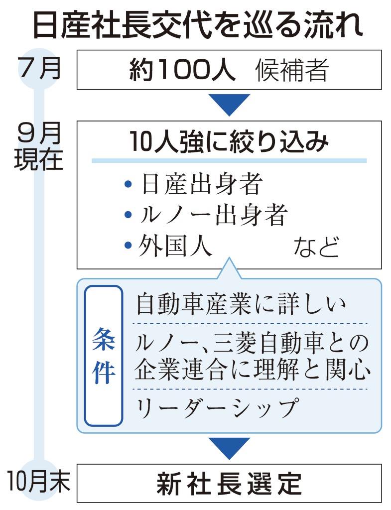 9日の会見で指名委の豊田正和委員長(元経産官僚)は、日産社内外の人材を候補者とすると表明。日産OB、企業連合を組む仏ルノーの出身者が含まれており、女性、外国人の名前もあるという。必要な資質としてはリーダーシップを発揮できることや、世界の自動車産業に詳しく、ルノーなどとの企業連合に理解があることを挙げた。