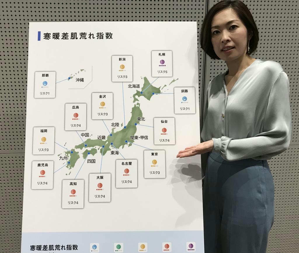資生堂は26日、季節や屋内外の寒暖差がもたらす肌の乾燥や肌荒れへのリスクレベルを分析した「寒暖差肌荒れ指数」を、日本気象協会と共同開発したと発表した。同日から協会のホームページ「tenki.jp」で公開されており、秋から冬にかけ寒暖差が高まる季節を前に、指数を通じてスキンケアへの注意を促したいとしている。公開は来年3月31日まで。