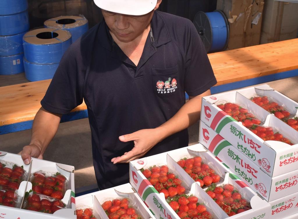 イチゴの出荷量全国1位の栃木県の代表的品種「とちおとめ」が2日、同県鹿沼市のJAかみつが南部営農経済センターで今季の初出荷を迎えた。