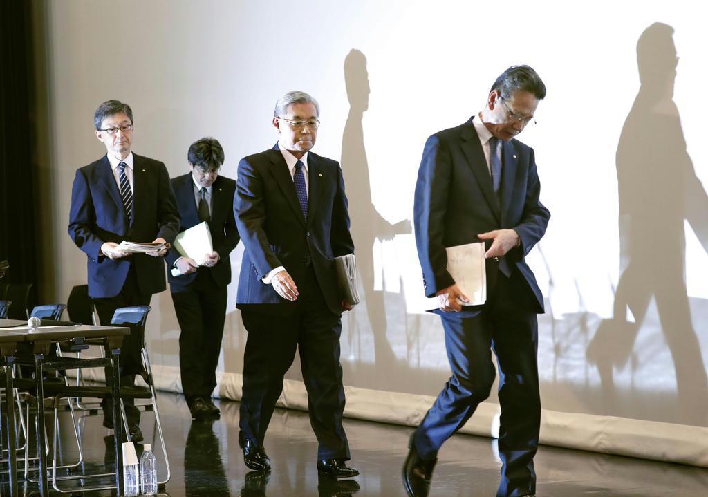 《開始から3時間半以上が経過した午後5時45分ごろ、会見は終了。岩根茂樹社長、八木誠会長らは改めて深々と頭を下げ、会場を後にした》