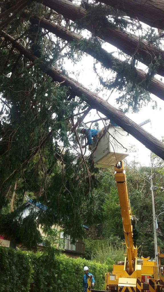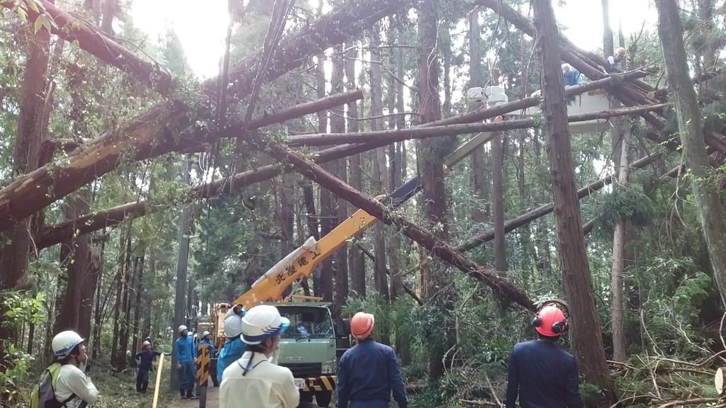 発電機車を取り付けた後は倒木の撤去を中心に行うため各地を回った。電柱が被害にあっている場所が多く、「倒木や大型の飛来物が電線や電柱に引っかかり、重みと風の負荷で倒れたようだ。ほかの災害と比べても圧倒的に倒木が目立った」(西田さん)。