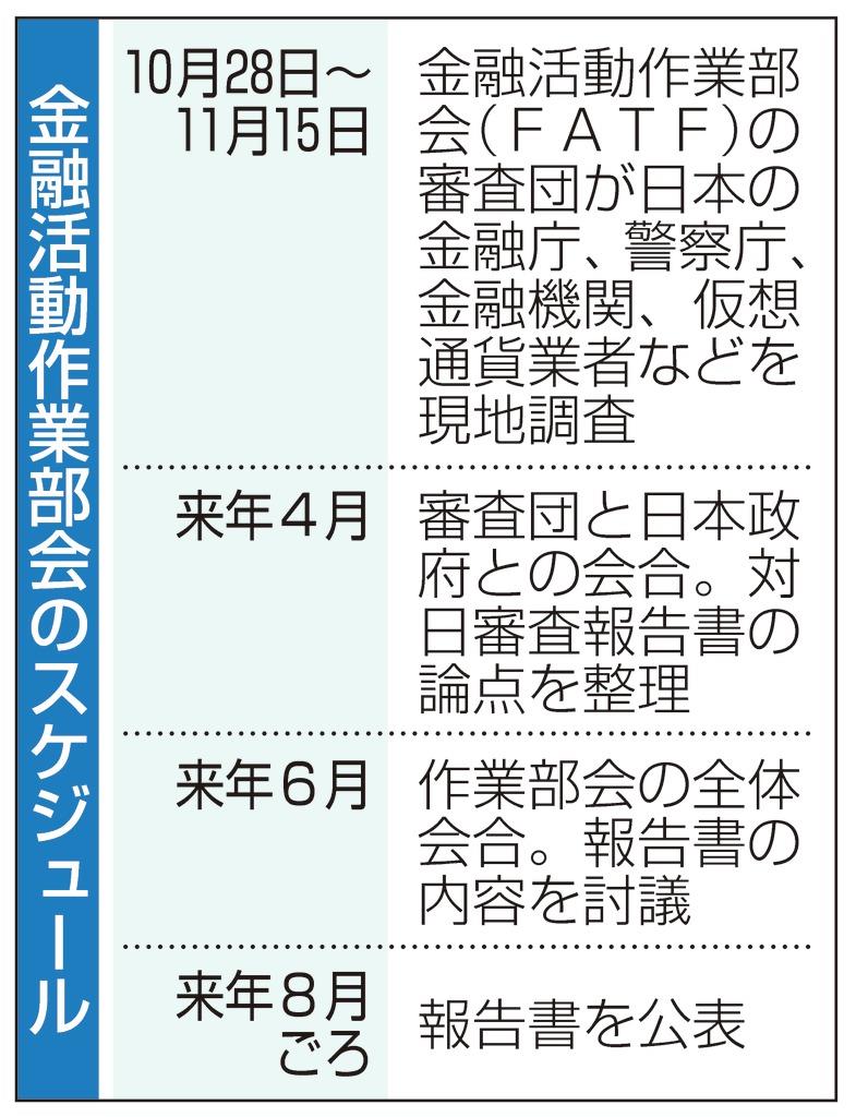 現地調査は11月15日までの予定。関係者への聞き取りを中心に、資金洗浄やテロリストへの資金供与が疑われる取引の届け出体制、テロリストの資産凍結制度、捜査体制など40項目を調べる。結果は「対日審査報告書」にまとめ、来年6月の作業部会の全体会合で内容を討議した上で、来年8月ごろに公表する。