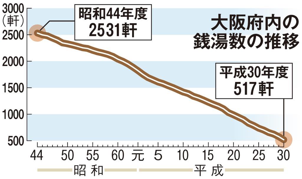 銭湯業界では、利用客が減りつづけており、大阪府環境衛生課によると、府内の公衆浴場は年間約40軒が廃業に追い込まれている。統計が残る最も古い昭和44年度が2531軒とピークで、その後は右肩下がりとなり、昨年度は517軒と10年間でほぼ半減した。高齢者らが何十分もかけて遠くの銭湯に通わなければならない“銭湯難民”も問題になりつつあるという。