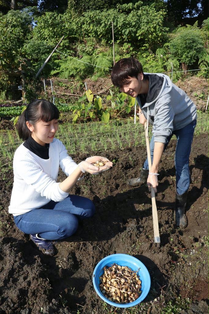 今回の収穫の参加者たちは鍬(くわ)を持って畑に入り、地中にある吹田くわいの茎の部分を掘り起こしていった。農園主の平野紘一さん(79)は「今年は暑かったが、大きく育った」と話していた。
