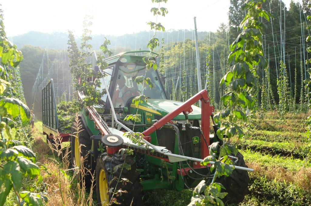 1ヘクタールの畑に、地面から5メートル程度の高さまで垂直に伸びたホップの緑色のツルがずらりと並ぶ。ドイツ製の専用機材を付けた大型トラクターが進むと、爽やかな香りとともに吸い込まれた。約1800株の収穫作業を3時間半で終えた。