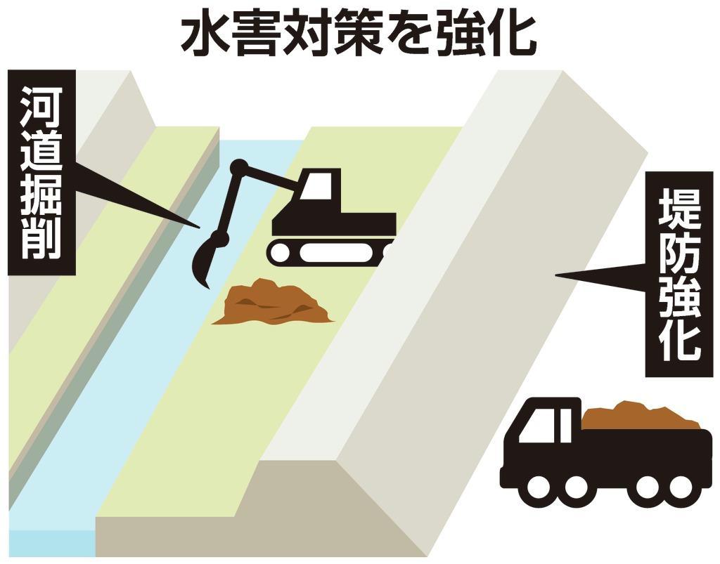 大規模な浸水や土砂災害の被害を最小限に防ぐため、氾濫(はんらん)発生の危険性が高い河川の底を掘るなどの対策を講じるほか、堤防をかさ上げするなどの強化策もとる。河川に放水できないほど大量の雨が降った場合に起きる内水氾濫の対策のため、雨水を貯める施設も整備する。