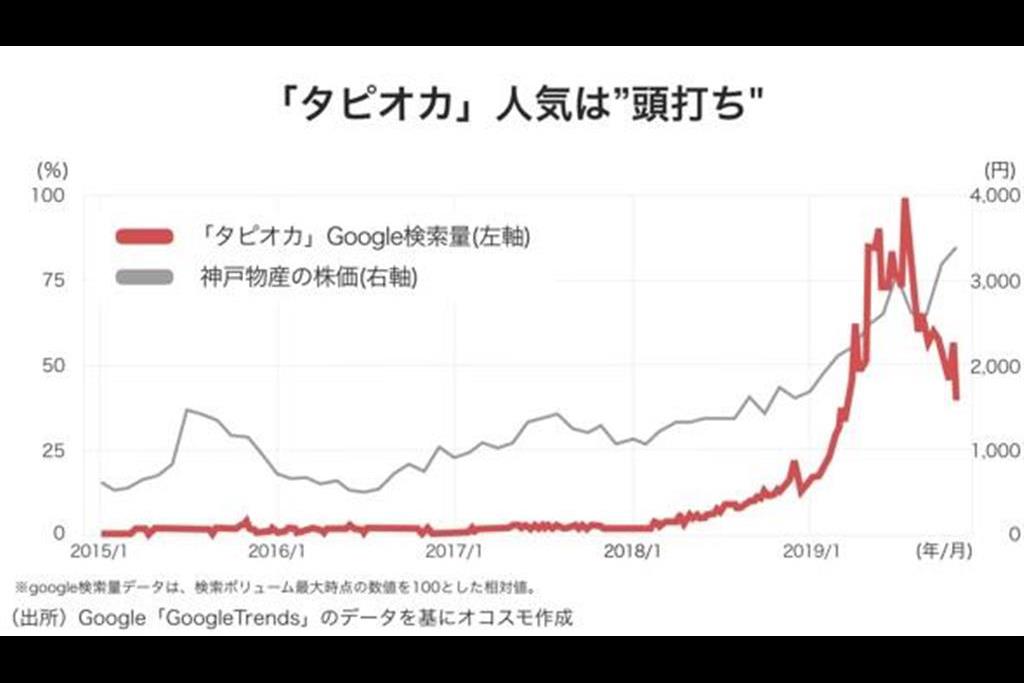 現に、「タピオカ」の人気度はすでにピークアウトを示唆している。図は、タピオカ関連銘柄として値上がりした神戸物産の株価とGoogleにおける「タピオカ」キーワード検索量を比較したグラフだ。