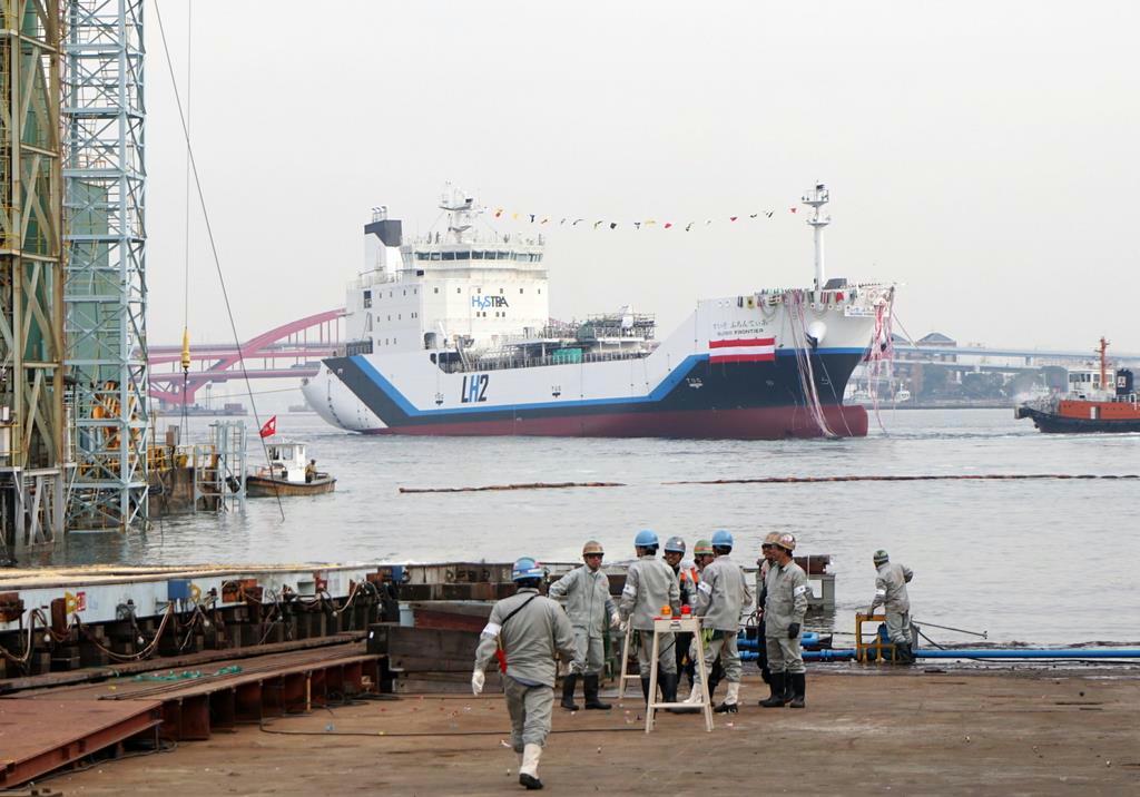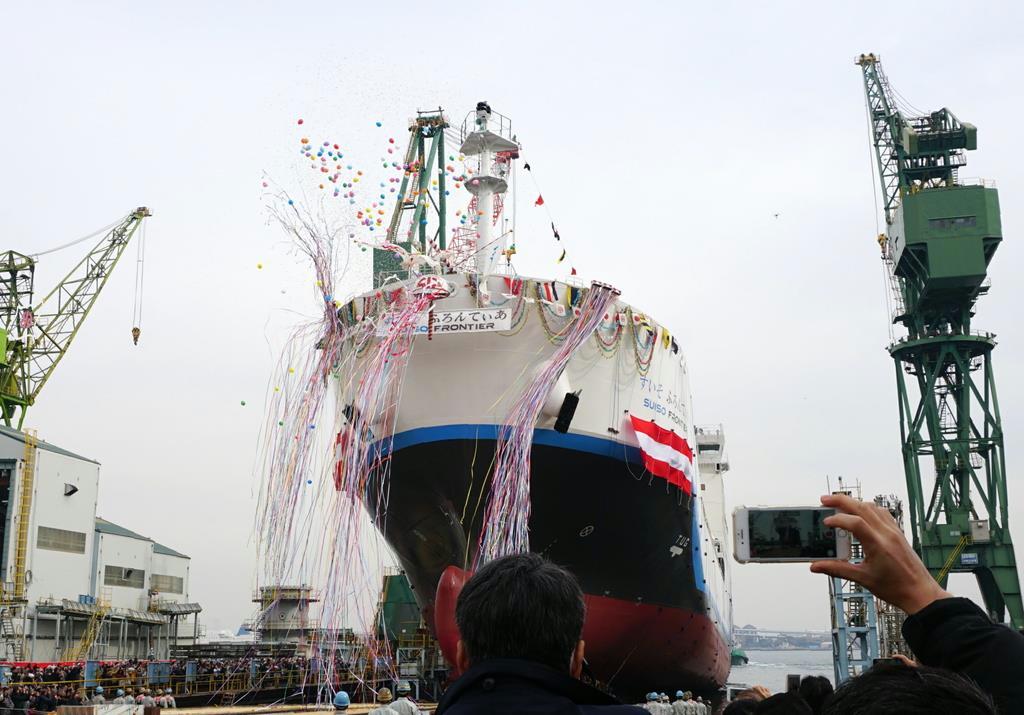 運搬船は「すいそ ふろんてぃあ」と命名された。全長116メートルで、総トン数は8千トン。播磨工場で製造中の1250立方メートルの貯蔵タンクを搭載し、来年秋ごろに完工する。式典では、関西の財界関係者や地域住民ら約4千人が見守る中、水しぶきを上げながら進水した。