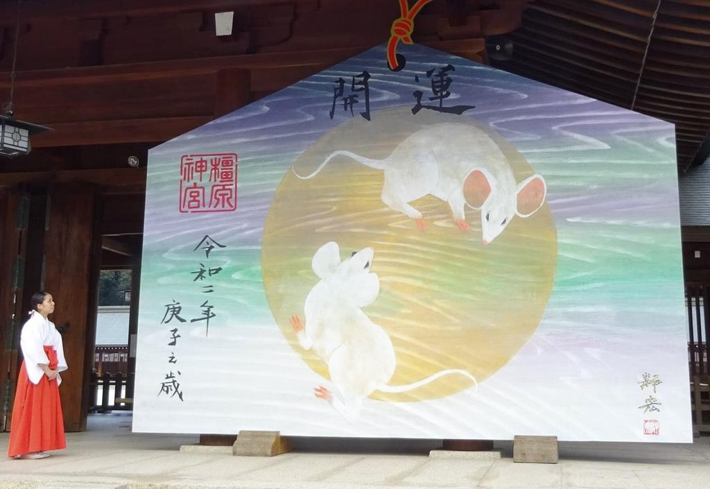 橿原神宮(奈良県橿原市)の外拝殿に、来年の干支「子(ね)」(ネズミ)を描いた大絵馬がお目見えした。境内は一足早く迎春ムードに包まれている。