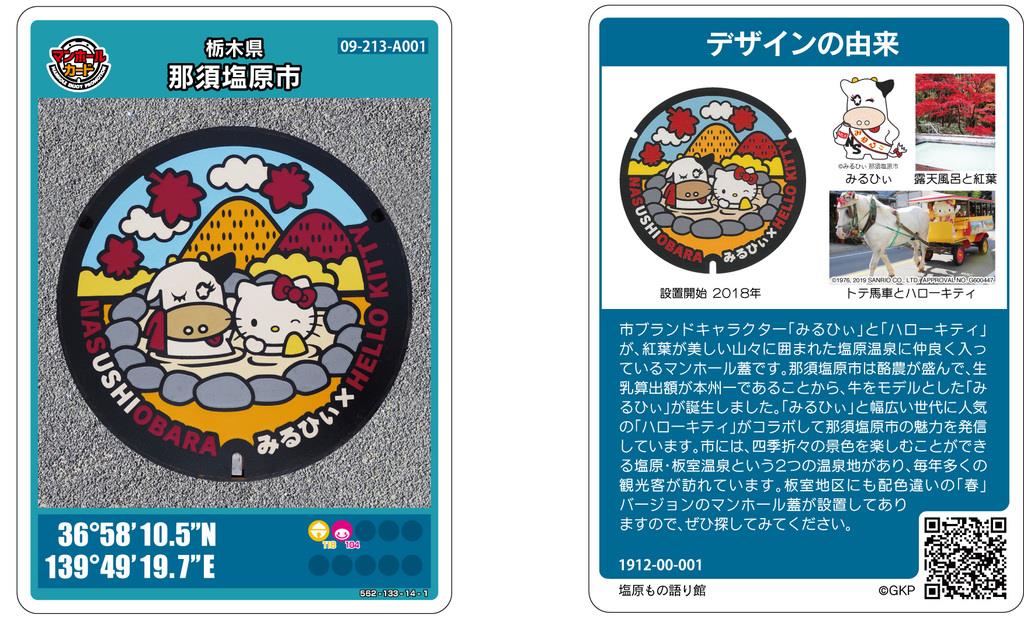 下水道広報プラットホーム(GKP)で同市のマンホールカードの登録が承認されたため、6千枚制作した。表はデザインマンホールの蓋の絵柄で、裏には塩原温泉地区の宿の露天風呂と紅葉の様子、トテ馬車に乗っているハローキティのほか、デザインの由来も紹介されている。