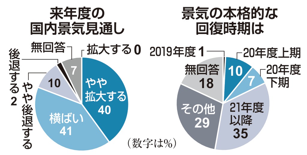 政府は公共工事を途切れさせないよう国土強靱(きょうじん)化を軸とした事業規模26兆円の経済対策を組んだが、大規模工事の着工には時間がかかり、「景気に現れるまで約1年必要」(機械)だ。このため、景気の本格的な回復時期は「21年度以降」が35%と最も多く、「19年度」が1%、「20年度」も17%にとどまった。「その他」を選んだ29%からも「当面、力強い回復を見込んでいない」(銀行)など弱気な意見が続いた。