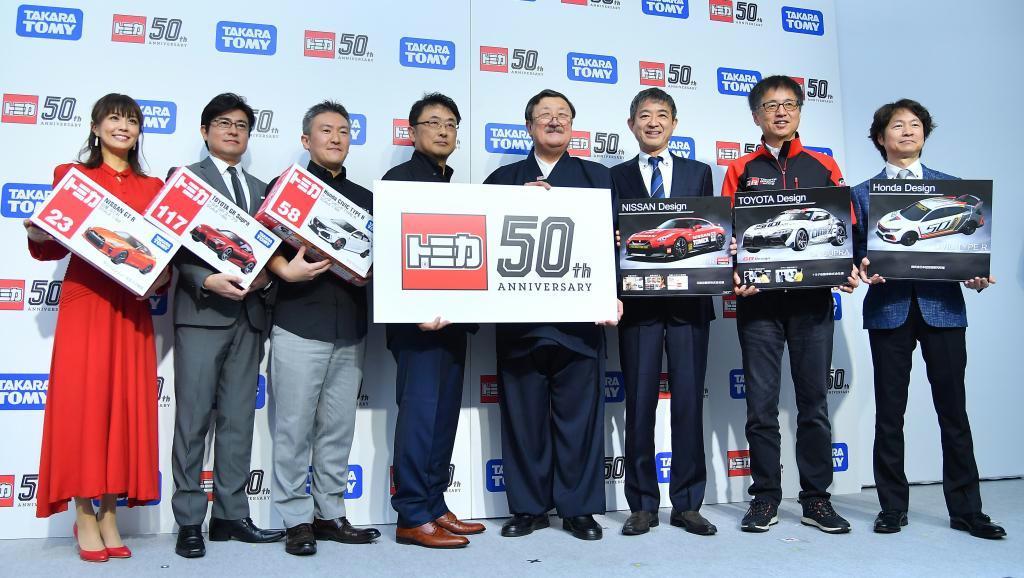 タカラトミーは15日、今年で発売50周年を迎えるダイカスト製ミニカー「トミカ」の記念企画を発表した。大手自動車メーカー3社がトミカ用にデザインした記念商品を発売するほかトミカを題材にした新アニメを4月から放送。ほかにも他企業との共同企画を年間を通して実施し、節目の年を盛り上げる。