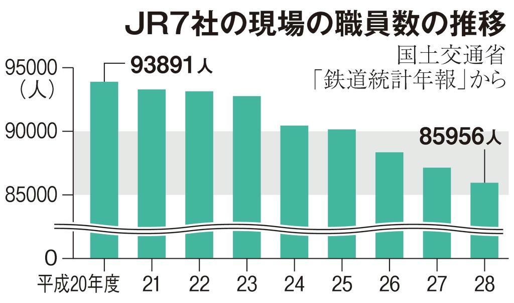 一方で、各鉄道会社では人手不足が問題となっている。国交省鉄道統計年報によると、JR7社の運転士など現場の社員数は20年度に9万3891人だったが、28年度には8万5956人に減少した。55歳以上が多くを占めており、今後は大量退職が進んでさらに人手不足が深刻化する見通しだ。