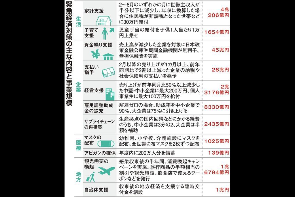 政府の緊急経済対策は新型コロナウイルスの影響で困窮した家庭に手を差し伸べ、資金繰りに行き詰まった企業を支える施策を盛り込んだ。緊急事態宣言で日本経済の停滞感はさらに強まっており、各施策の執行のスピードが重要になる。項目別にまとめた。