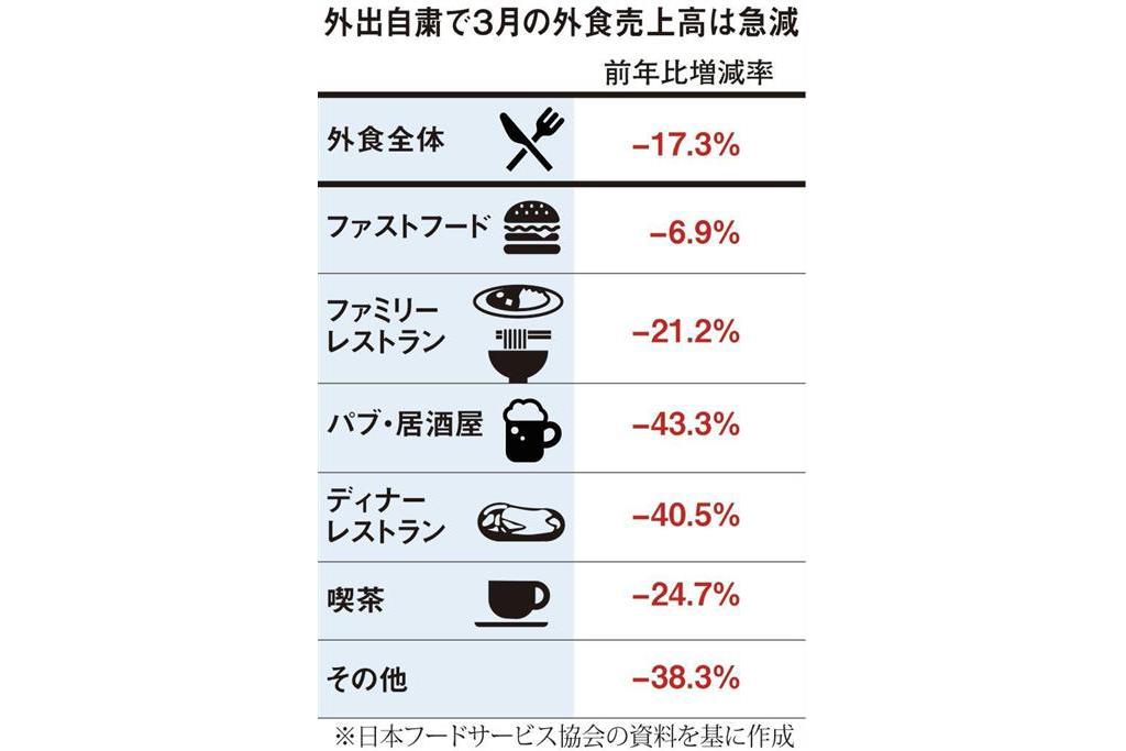 3月の外食売上高の落ち込み(17・3%減)は、東日本大震災が起きた平成23年3月の10・3%減を抜いた。業態別では、パブ・居酒屋43・3%減、ディナーレストラン40・5%減となり、お酒を提供する飲食店の落ち込みが大きかった。本来であれば歓送迎会などで書き入れ時だった。