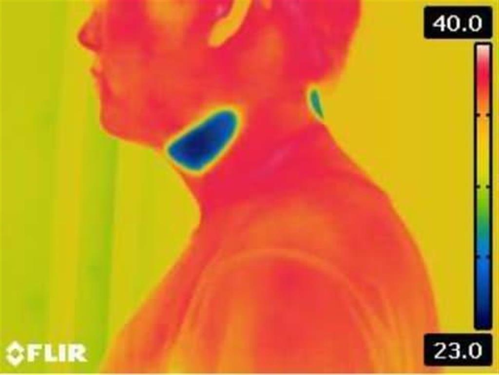 同機は首に掛ける冷却部と、腰に装着するラジエーター/バッテリー部とで構成。電源を入れるとネック部(冷却部)の温度が下がり、首を流れる頸(けい)動脈から血液を冷却する。これにより、深部体温の上昇を抑制する効果が見込めるという。