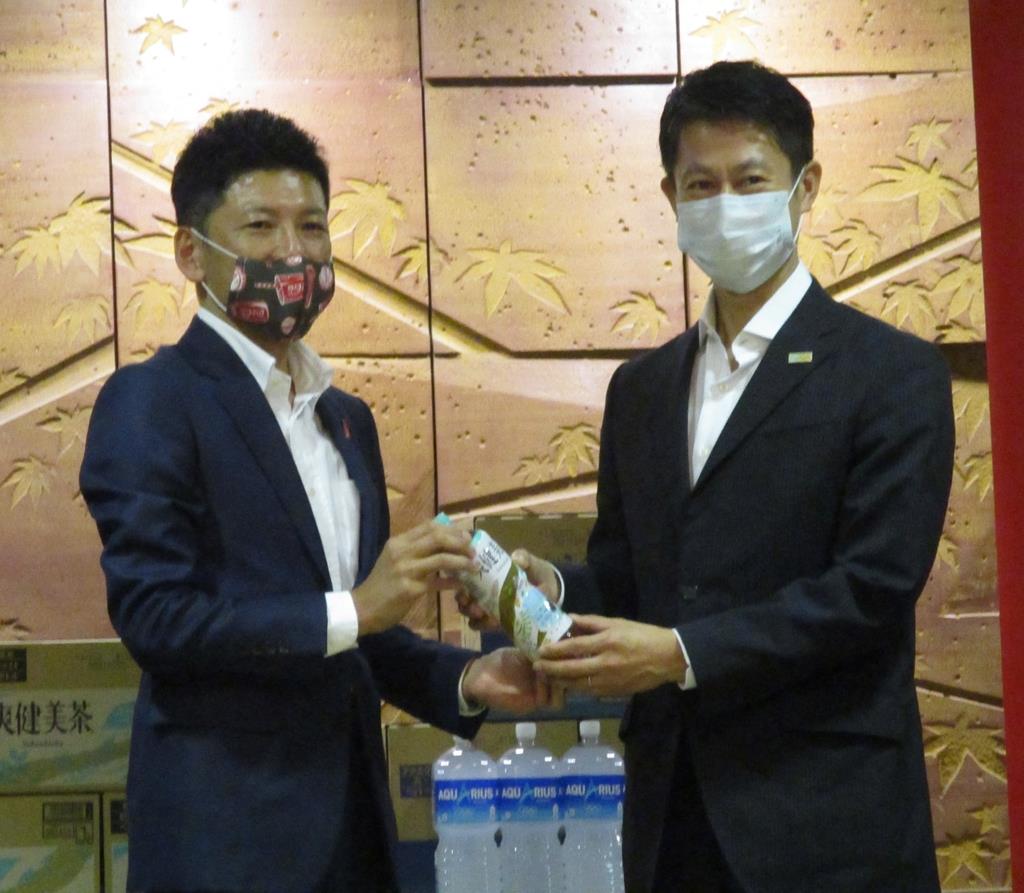 県庁を訪れた升井(ますい)慎一工場長は「こんな短い期間で復活できたのは、地域や行政の多大な尽力のおかげ」と、湯崎英彦知事に工場の再稼働を報告。同工場の初回製造品を試飲した湯崎知事は「ますますさわやかでフレッシュな味になった。街の雇用の観点からも地域の一員として活躍してほしい」と激励した。
