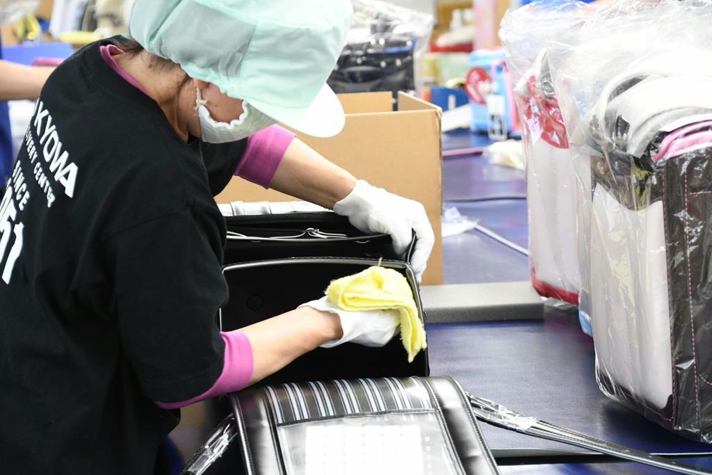 千葉県野田市にある同社の工場では、手袋をした従業員が真新しいランドセルの外側、そしてカバーを開けて内側や底の部分などにも除菌スプレーをかけ、ていねいにふきんで磨いていた。作業が終わると、透明なビニール袋に入れて「除菌済み」と書かれたシールを貼り、ひとつずつ箱に詰めていた。