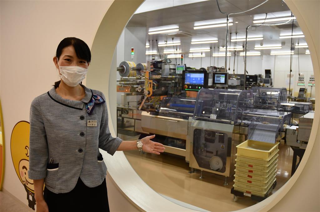 月化粧ファクトリーは2階建てで、延べ床面積約7千平方メートル。工場には製造工程をのぞき窓から見学できるスペースがあり、菓子の歴史や素材について学べる展示などもある。見学後はまだ温かい月化粧を試食できる。8月中旬から、予約制の「お菓子教室」を開催することにしている。