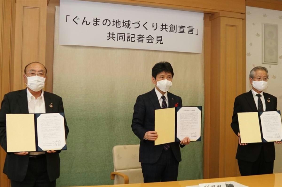 群馬県と同県信用金庫協会(峯川卓美会長)、同県信用組合協会(小林正弘会長)は12日、3者が互いに連携を取り地域経済の持続的発展に取り組むことをうたった「ぐんまの地域づくり共創宣言」を発表した。