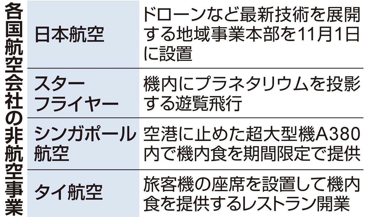 ANAホールディングス(HD)が27日に発表する事業構造改革では、航空事業以外の収益力強化策を盛り込むが、航空事業一本足からの脱却を目指して新規事業を推進する航空会社は、ANAHDだけではない。新型コロナウイルス禍で本業の航空事業が滞る中、日本航空も小型無人航空機(ドローン)など最新技術を活用する地域サービスを新たな収益源の柱に掲げる。世界各国の航空会社も、シンガポール航空が超大型機をレストランとして活用するなど、非航空事業を模索し始めている。