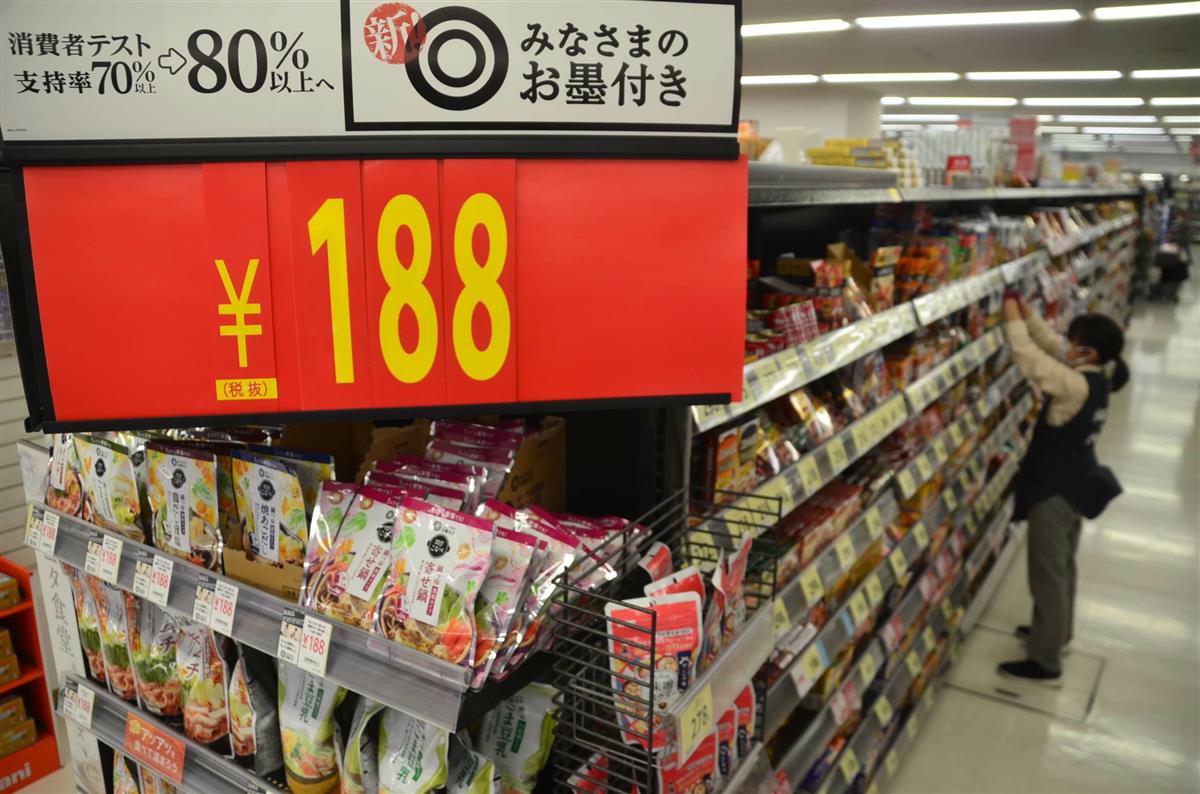 来店客に値下げ商品であることを知らせる赤い値札が、商品棚のあちこちに取りつけられている西友赤羽店(東京都北区)の食品・日用品売り場。買い物かごを下げた来店客が値札の前で思わず足を止める。