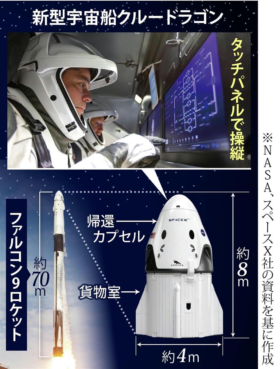 クルードラゴンは、米スペースX社が米航空宇宙局(NASA)との契約分だけで3千億円以上を投じて開発した。飛行士が乗る円錐(えんすい)形に近い帰還カプセルと貨物室で構成され、全長約8メートル、直径約4メートル。3人乗りのソユーズと同じカプセル型だが、船内はより広い。通常は4人が搭乗するが、一般人による将来の宇宙旅行を見越して最大7人が乗り込める。