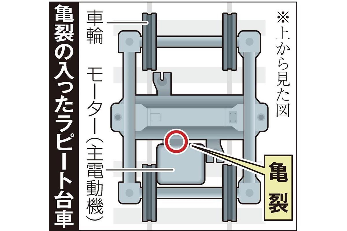同社は平成17~19年、ラピートの台車に補強材を取り付ける作業を実施。同社によると、補強材は他の一般的なものと比べて小型だった。溶接の強度を上げる特殊な方法が必要となったが、従来と異なる部署が担当したため、手法を決めた部署から現場に正しい情報が伝わらず、溶接部分に欠陥が生じたという。