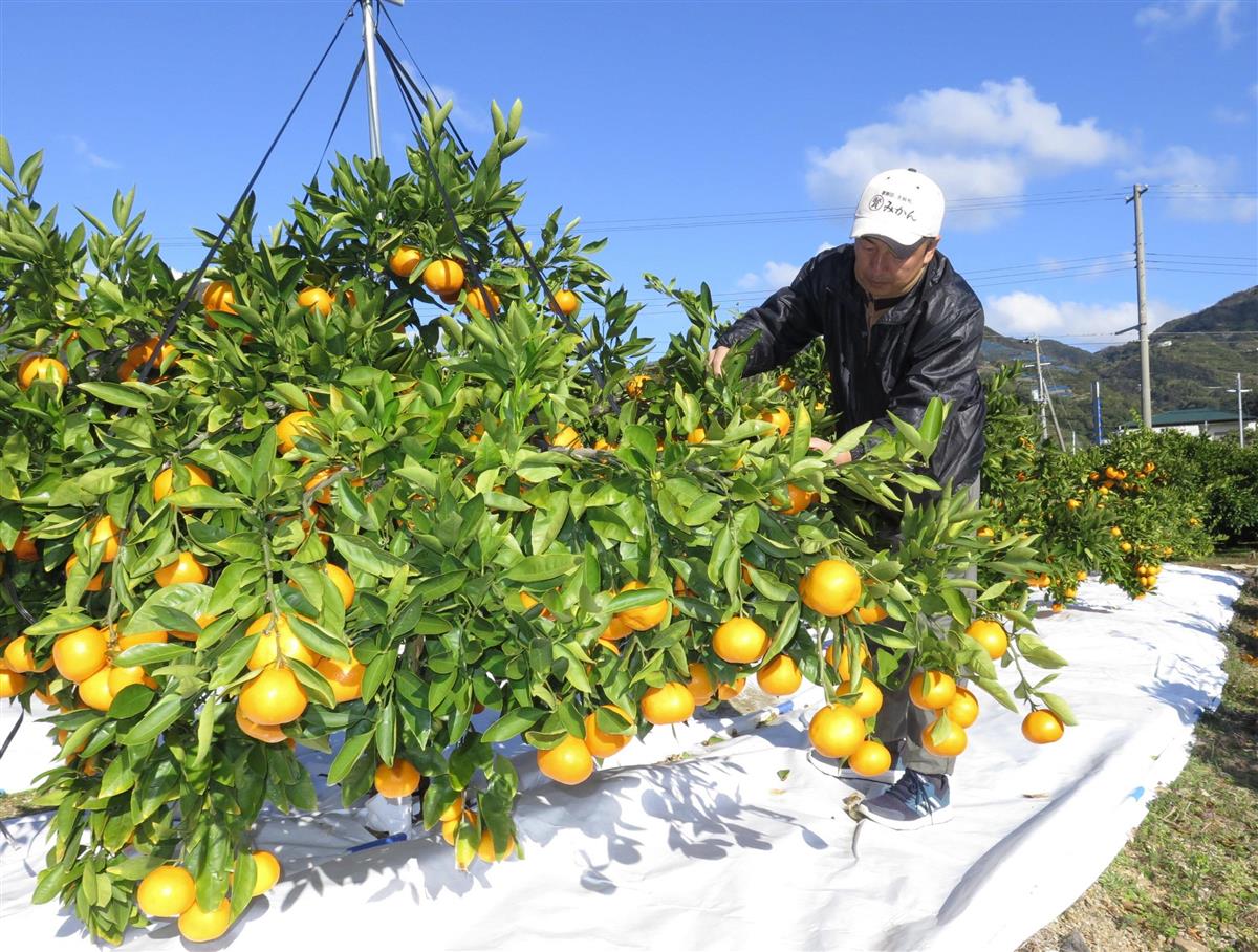 水はけの悪い農園に雨水遮断用の特殊シートをかぶせ、過度な水分を防いで糖度の高い温州ミカンを生育する「マルチ栽培」の実証実験に、和歌山県と栽培農家が協力して取り組んでいる。今季の収穫期を迎え、甘みが増すなどの効果が確認されており、県は来年度も実証実験を継続。生産量、産出額に販売単価も加えた日本一〝3冠〟を達成したい考えだ。(西家尚彦)