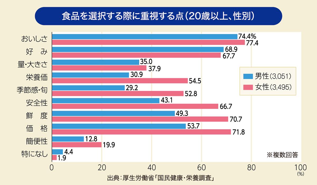 厚生労働省による「国民健康・栄養調査」(※6)によると、「食品を選択する際に重視する点」で価格や栄養価といった条件を抑えて「おいしさ」が1位となった。