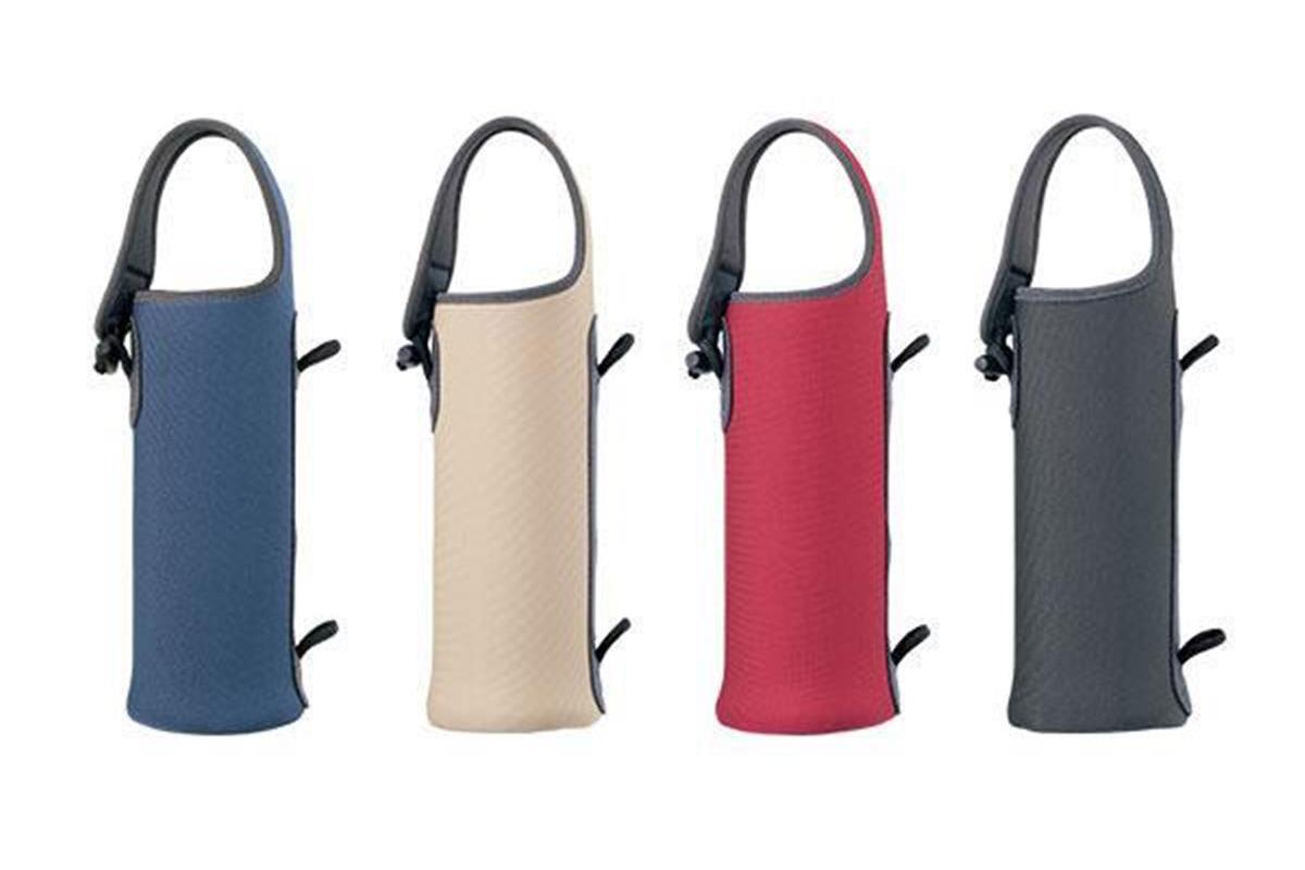 ウエットスーツにも使われる弾力性のあるストレッチ素材の生地。カバーは自立しやすい構造で洗濯できる。3カ所ある留め具に持ち手をつけ替えることで、3通りの持ち方ができ、トートバッグやリュックに引っ掛けることや、手や腕にかけて持ち歩くことが可能。カバーをつけたままでも飲みやすい本体形状。せんが回しやすい「滑り止めつき」。