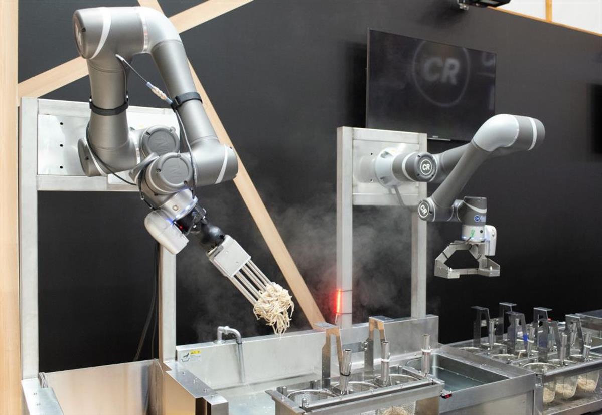 同社は昨春、JR中央線東小金井駅(東京都国分寺市)の駅そば店に単腕式の調理ロボを試験的に導入。その時は1時間当たり50食前後を調理していた。今回の2本腕のロボではその3倍に当たる150食も調理ができるという。