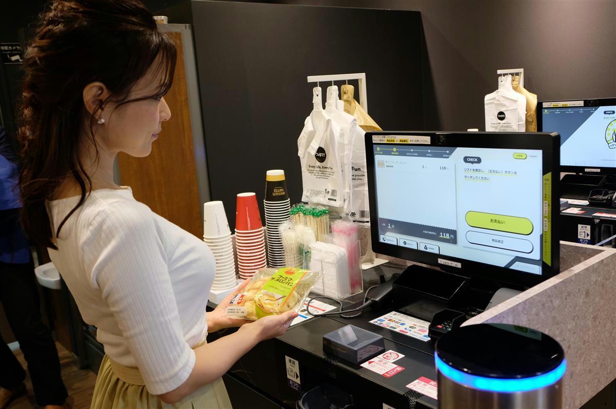店内の天井に配置したセンサー付きカメラ48台と商品棚のセンサーで、入店ゲートを通過した客の動きを追跡し、手に取った商品を自動で記録。客が無人レジの前に立つと、選んだ商品と金額、合計購入代金が画面に即座に表示される。支払いは電子マネーなどのほか、利用者が多いことから現金にも対応した。店の事務所には従業員1人が常駐、年齢確認が必要な酒類の会計時にはレジ画面のカメラ越しに目視で年齢認証を行う。