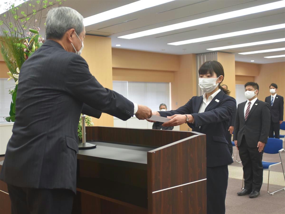 入社式は感染防止対策を徹底して開催。出席する役員を大幅に減らし4人にして、全員がマスクを着用。時間を約20分に短縮し、辞令は伊倉穂乃香さん(23)が新入社員代表として田村明比古社長から受け取った。