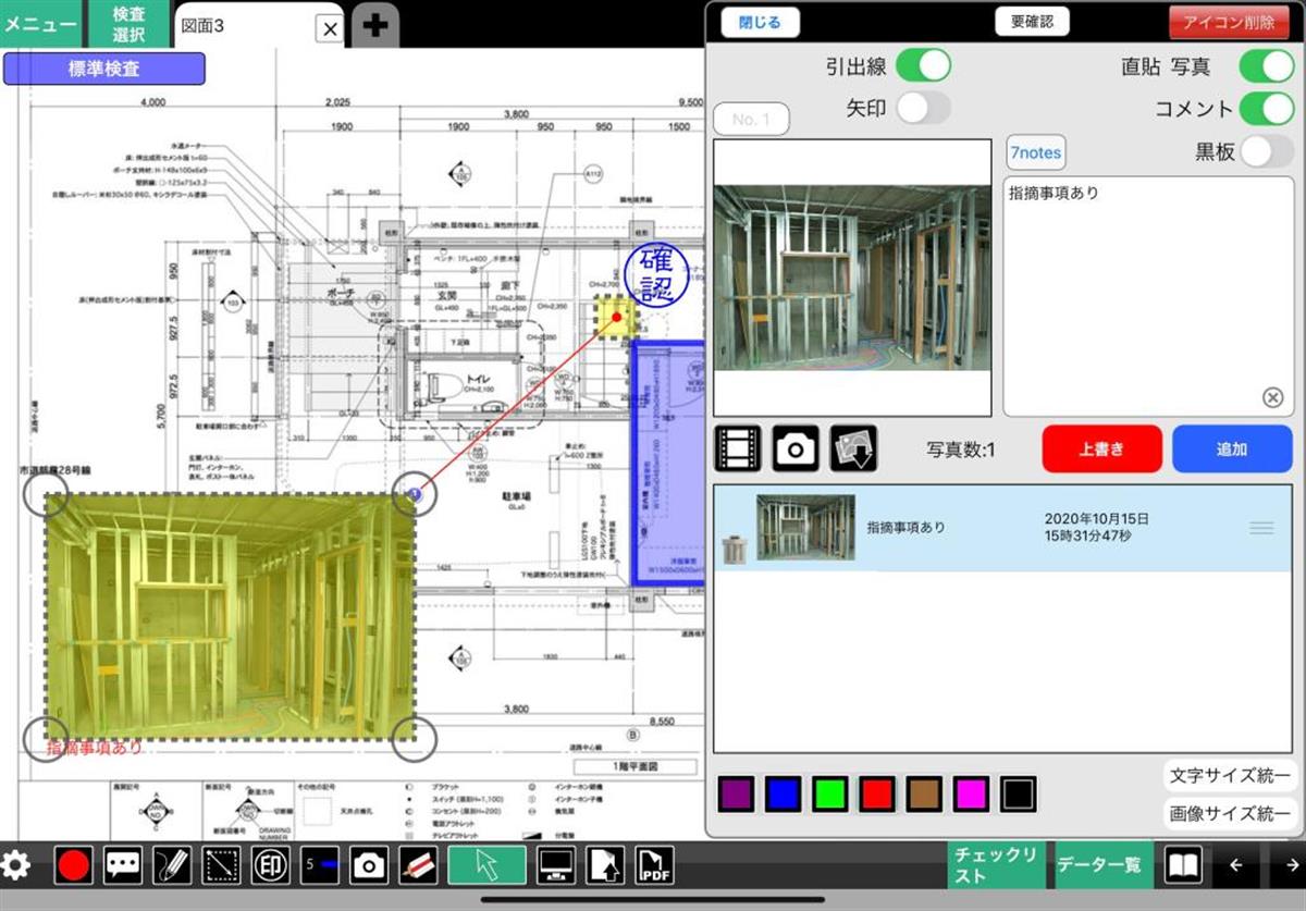 同社が開発した建設現場向け施工管理アプリは、あらかじめタブレット端末に取り込むことで、図面や施工現場の写真、検査記録などその場で登録。登録されたデータはクラウド基盤上で管理。複数人で共有できる。