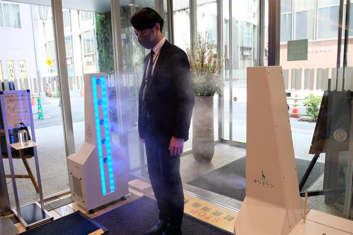 産業用ノズルの国内トップメーカー、いけうち(大阪市西区)と共同開発した。不特定多数が出入りする商業施設やホテル、交通関連施設、大型イベント会場などの入り口に、高さ133センチ縦型の親機と子機を向かい合わせてゲートのように設置。人が通るとセンサーが反応し、親機と子機それぞれ5カ所に取り付けたノズルから、成人の首下から足元に向けて衣服がぬれない程度の微細な霧(平均粒子径20マイクロメートル)を約3秒間、12.5ミリリットル噴霧する。