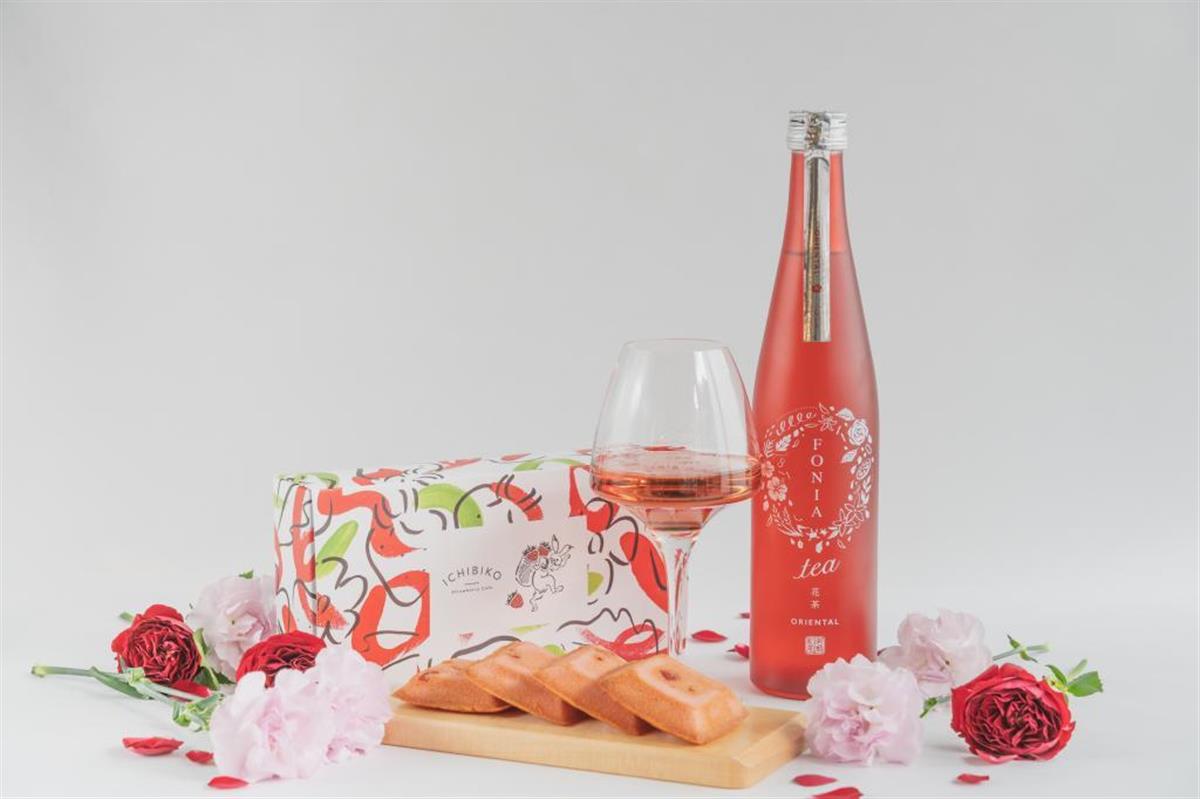 同セットは両社の商品を詰め合わせたもの。WAKAZEは植物酒「フォニアティー」を用意。フォニアティーは、米の白麹や茶葉発酵させ、発酵中のもろみの中にローズなどの花びらを漬け込んで作り上げた。華やかで上品な香りと茶独特の渋みが程よく調和した味わいが楽しめる。