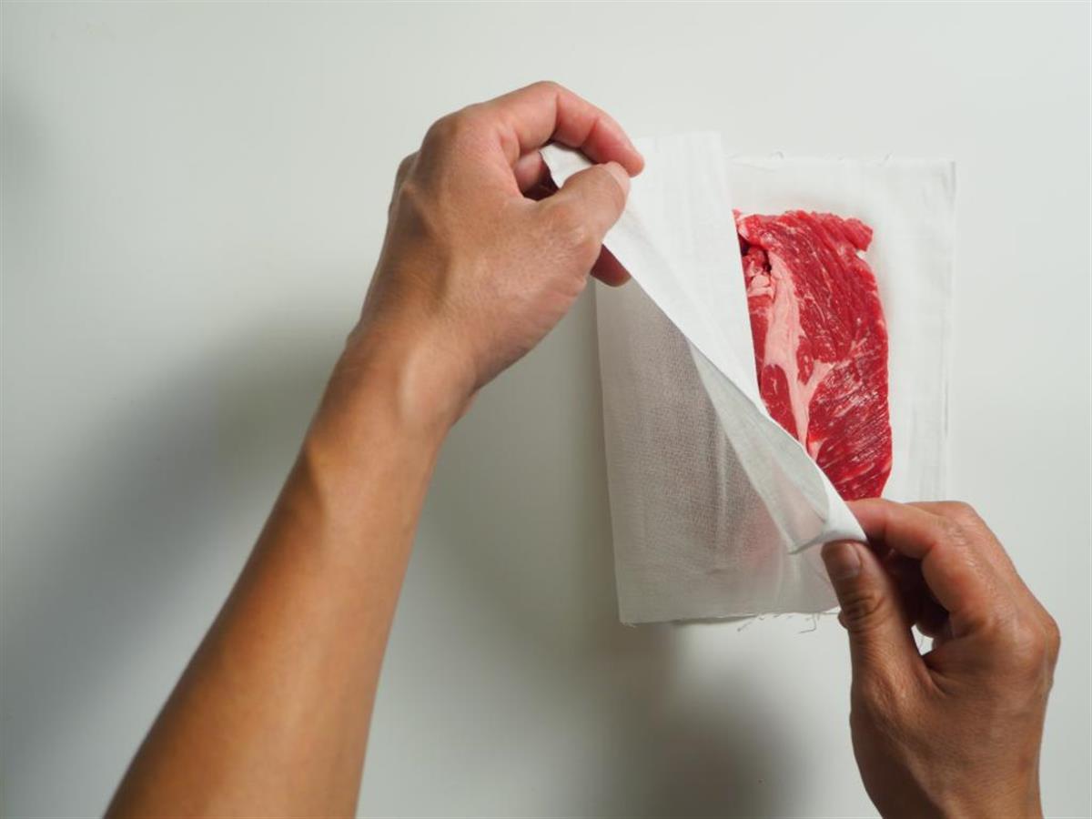 「発酵力オイシート」と名付けられたこのシートは、肉や魚などをシートに巻くだけ。シートの大きさは33センチ×20センチ。シートに付着している熟成に必要な発酵菌の働きにより、食品の腐敗や変色、悪臭を抑える。